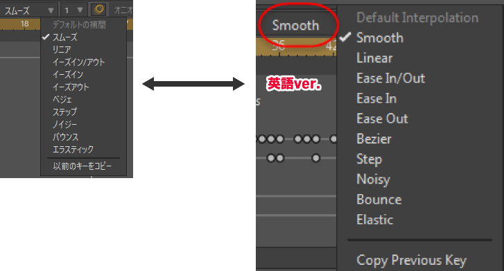 前の章で紹介した通り、補間の種類を選択できるメニューが3箇所ありますが、使われている単語がそれぞれで微妙に異なることにお気づきでしょうか?