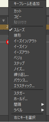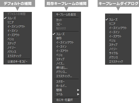 他にも、デフォルトの補間か、既存キーフレームの補間かによって、メニュー項目も微妙に異なることにも注目です。