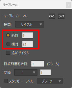 キーフレームダイアログで、絶対サイクル、または相対サイクルを指定できます。