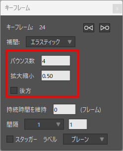 キーフレームダイアログでバウンスのスケールを制御でき、エラスティック効果を逆方向に発生させることもできます。