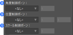 - [ボーンの抑制]ダイアログ内の角度、位置、スケールのうち、あてはまる項目のドロップダウンメニューから、コントローラーとして使用するボーンを選択する。