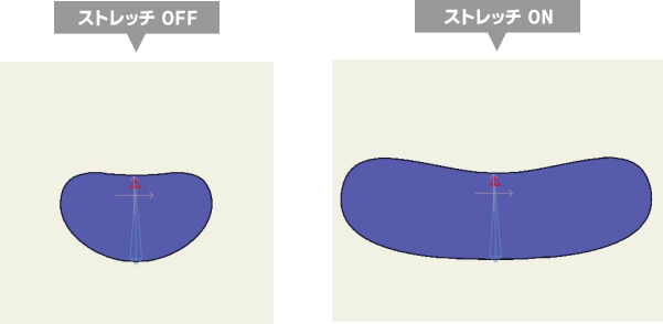 例えば、ボールを押し潰したときは、押した部分が凹んで、凹んだ分が横に伸びますよね。この「ストレッチ拡大縮小」をオンにすると、このような現象を再現できます。