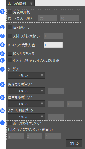 前章で表示した「ボーンの抑制」ダイアログの画面スクショには、項目ごとに番号を表示しました。この章では、それぞれの項目についての詳細です。