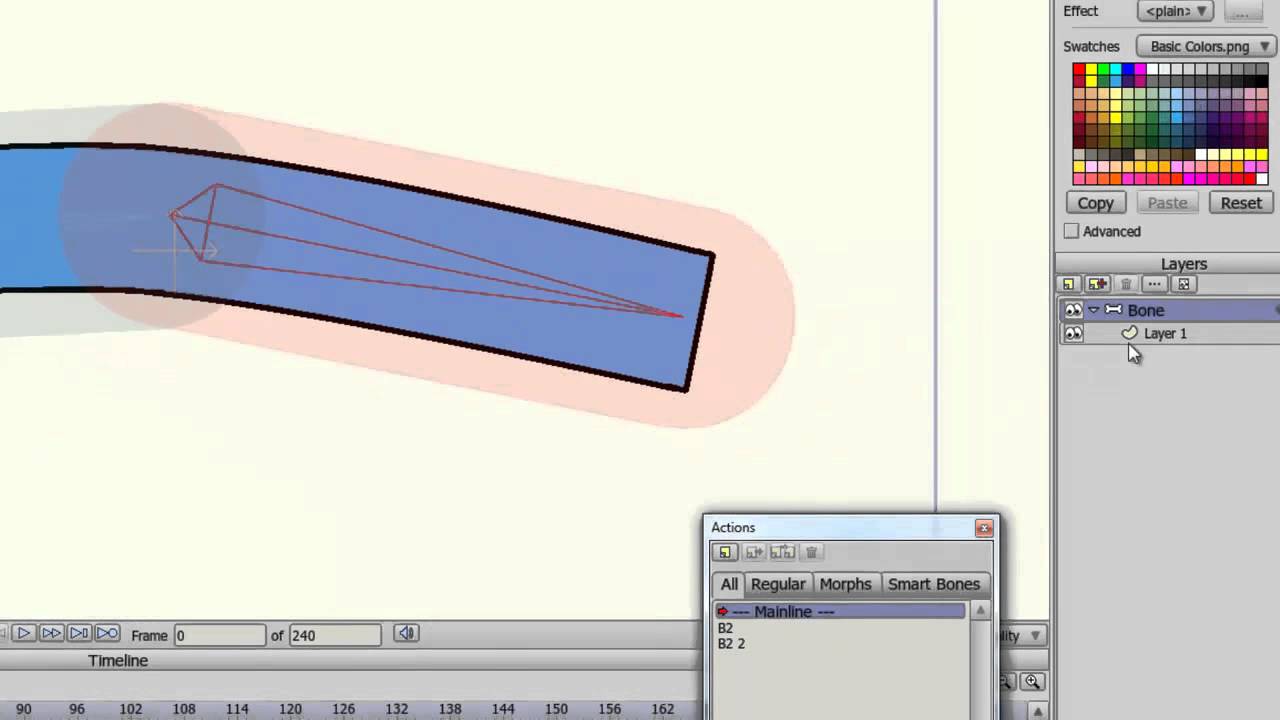 - ボーンレイヤーを選択し、[ボーンを操作]ツールを使ってアクションの反映を確認する。必要なら修正する。