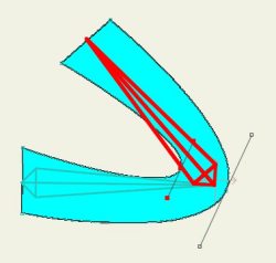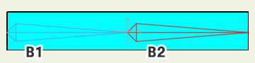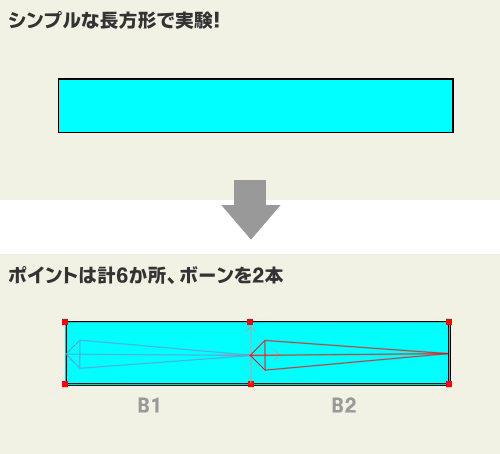 長方形には、中央にポイントを追加しておきます。そして、下図のように2本のボーンを追加して、ボーン「B2」を曲げた時のひずみを直していきます。