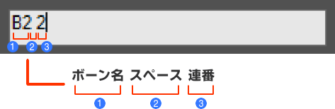 - 同じボーンに対する2つ目のアクションなので、「ボーンの名前、半角スペース、数字」になります。