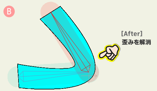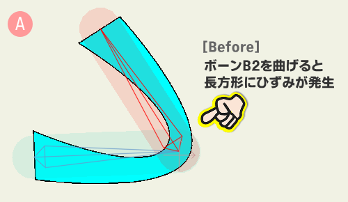 これに「アクション」を使ってボーンB2が回転した時の正しい形を登録しておくと、その後は登録した通りに動いてくれるようになります。(下図B)